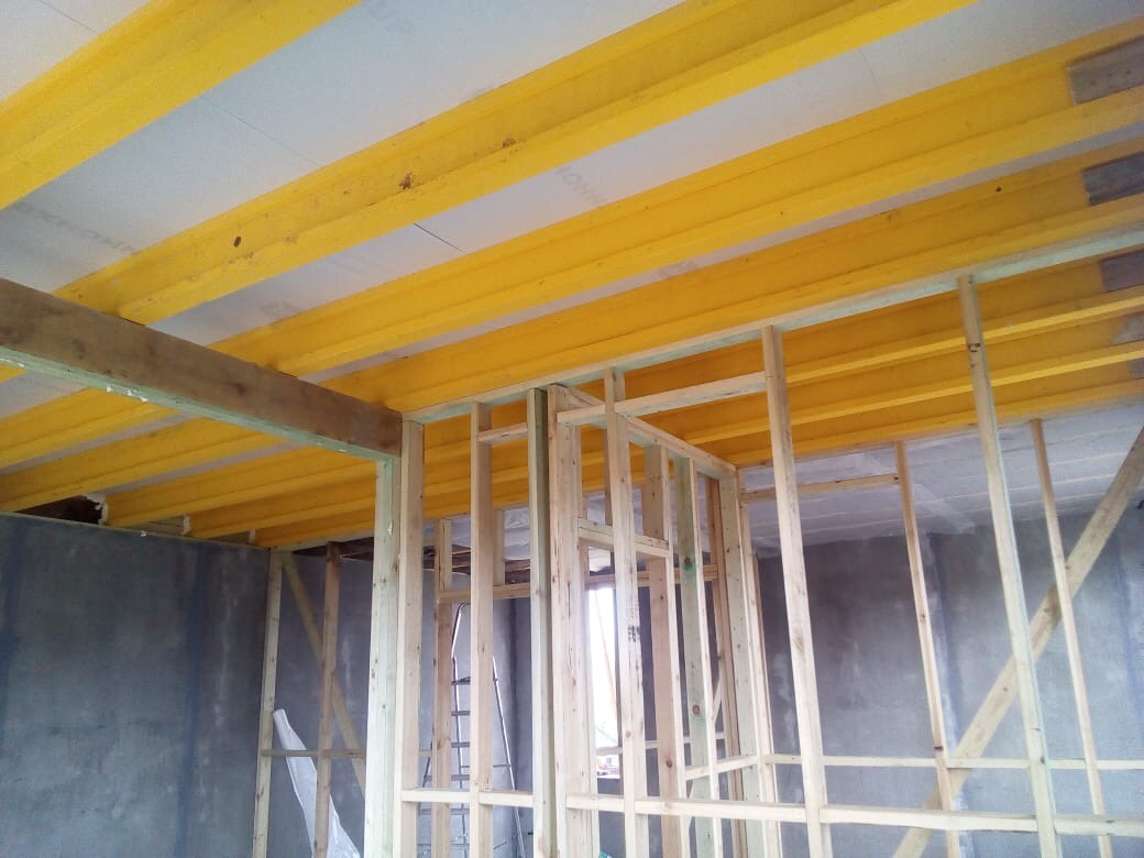 В межэтажных перекрытиях в качестве несущих лаг мы применяем двутавровые балки собственного производства с влагостойкой 24 мм. фанерой в сердечнике.