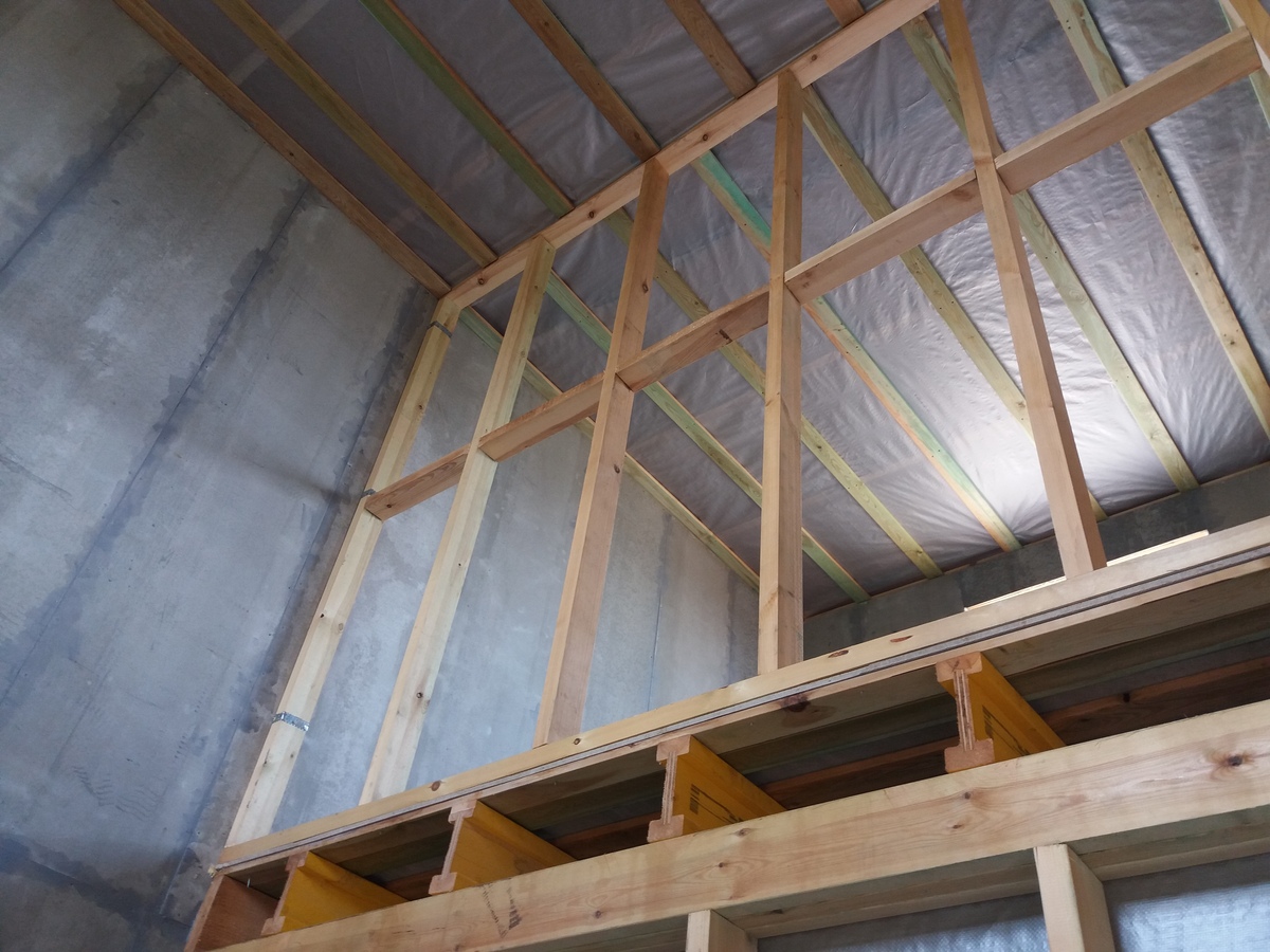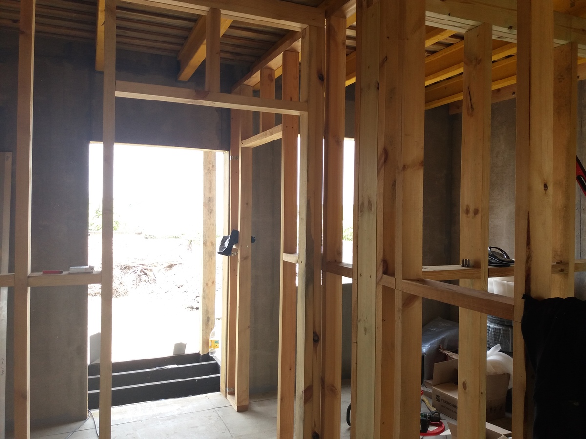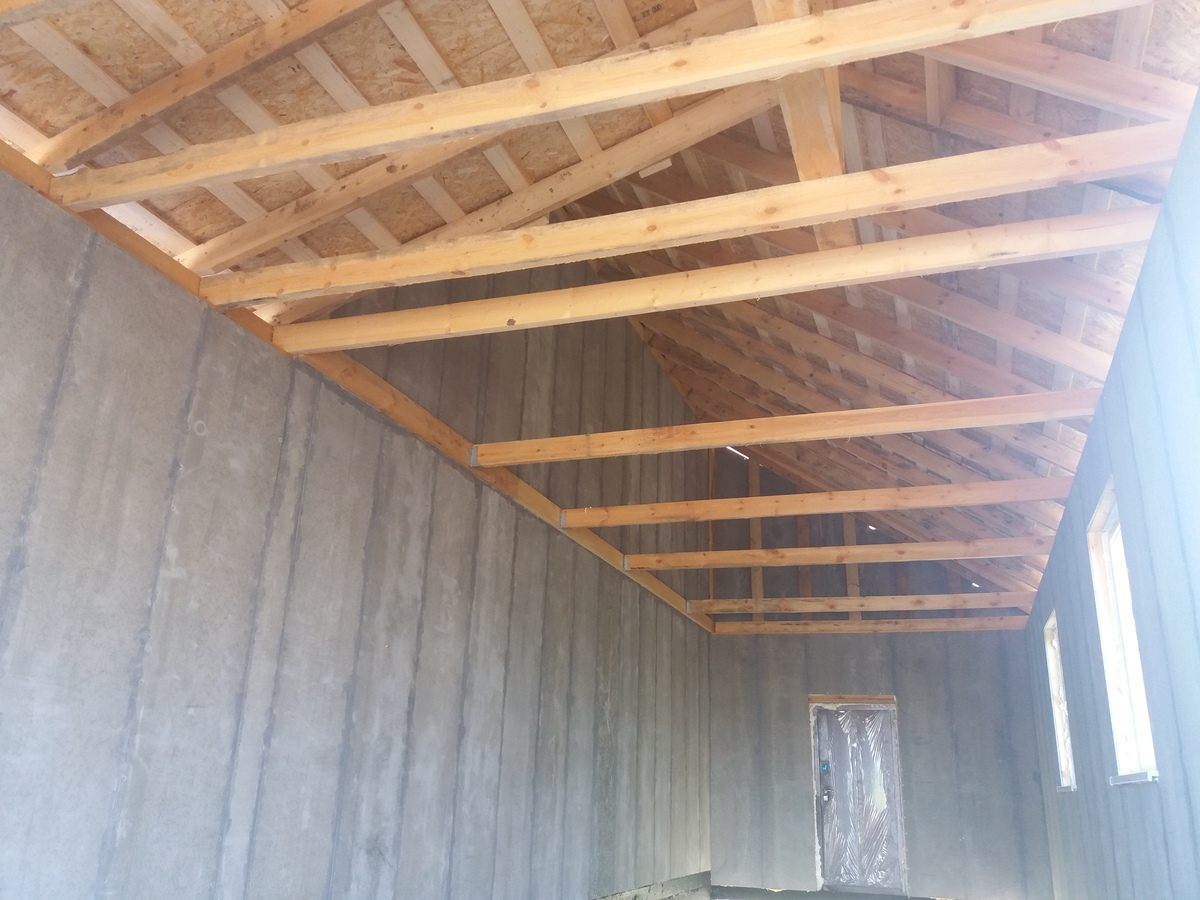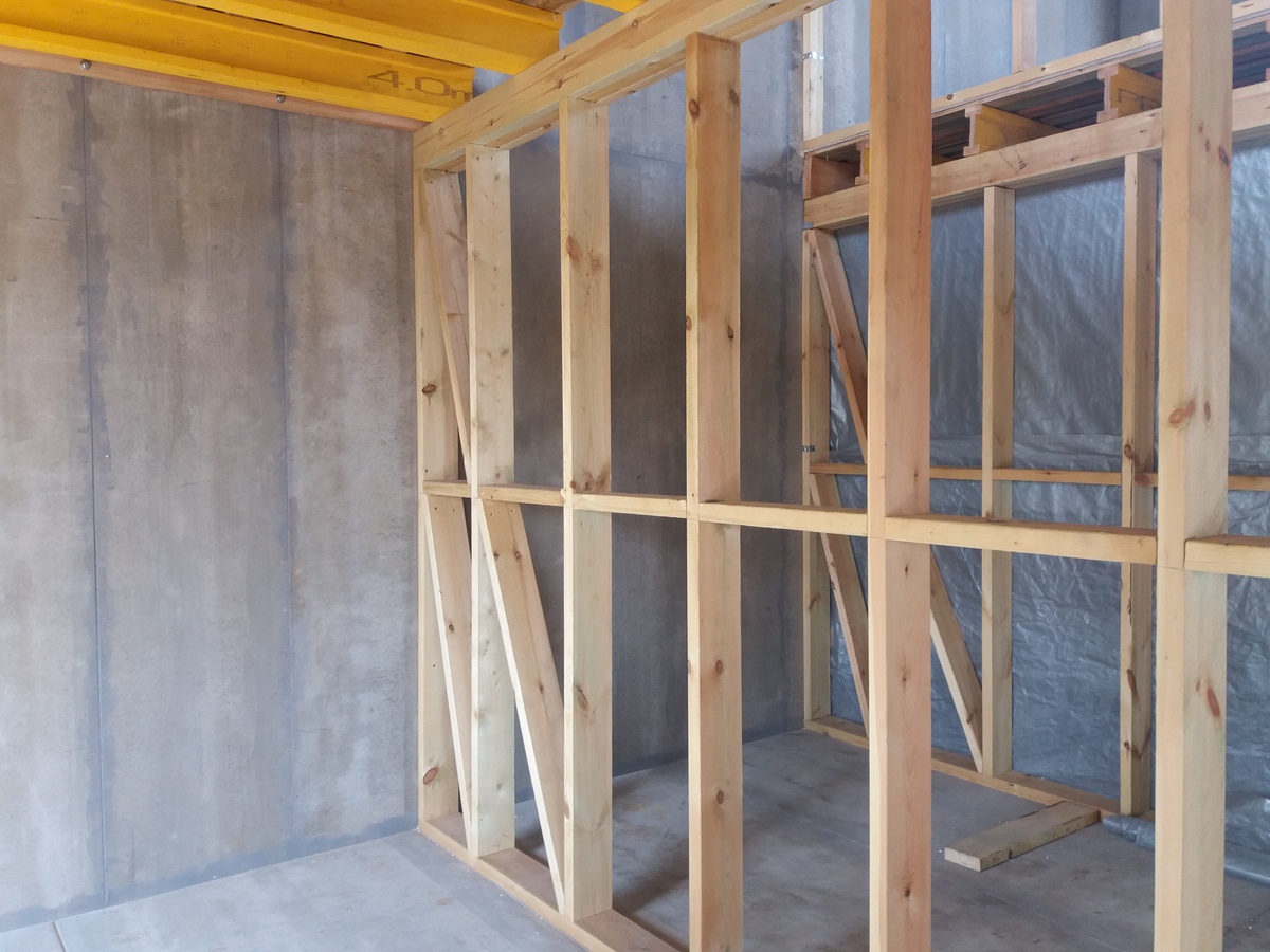 из СИП панелей из ЦСП размером 2700*1200*168 мм с антисептированным калиброванным пиломатериалом камерной сушки (46*140 мм). Монтаж каркасов несущих перегородок из пиломатериала 38*89 мм (76*89 мм).