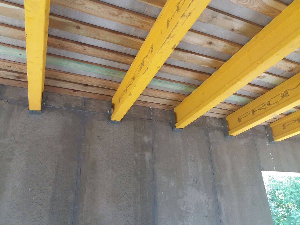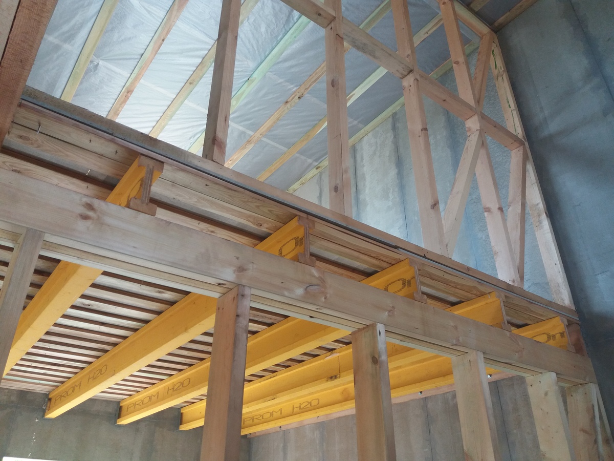 • Межэтажное перекрытие: Балки перекрытия БДК 250/300/350х65 мм, верхняя поперечная обрешетка 22х90 мм, сплошной настил листы ЦСП 12-16 мм. Звукоизоляция перекрытия. Пароизоляция перекрытия. Готовность пола и потолка под чистовую отделку.