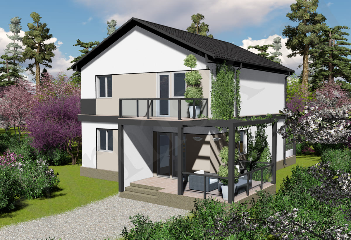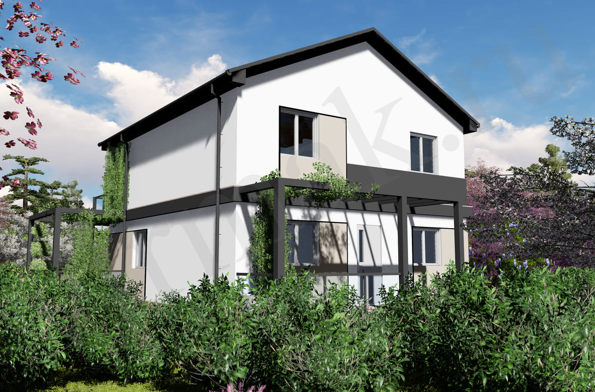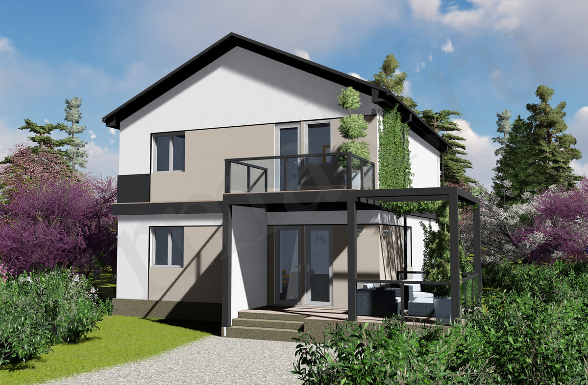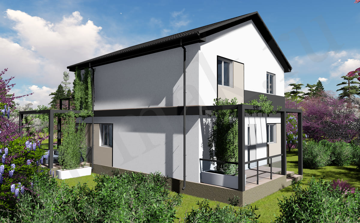 • Плоская или скатная утепленная кровля (пароизоляционная пленка, утеплитель вата на основе стекловолокна или базальта, гидро-ветрозащитная мембрана) с покрытием из металлочерепицы, полимерной мембраны или гибкой черепицы. (цена отличается от выбранного типа) (Ширина карнизного свеса от 30 см. Водосточная система в стоимость не входит