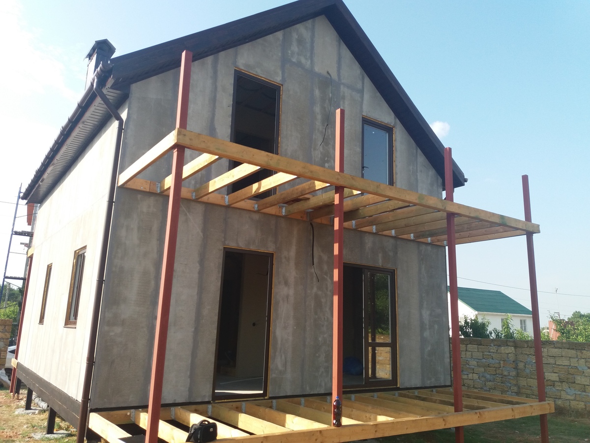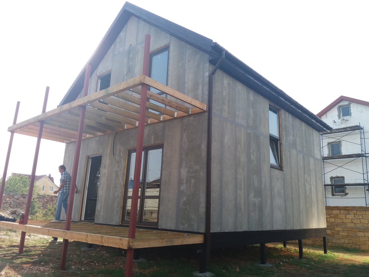 из СИП панелей из ЦСП размером 2700*1200*168 мм с антисептированным калиброванным пиломатериалом камерной сушки (46*140 мм). Монтаж каркасов несущих перегородок из пиломатериала 38*89 мм (76*89 мм).
