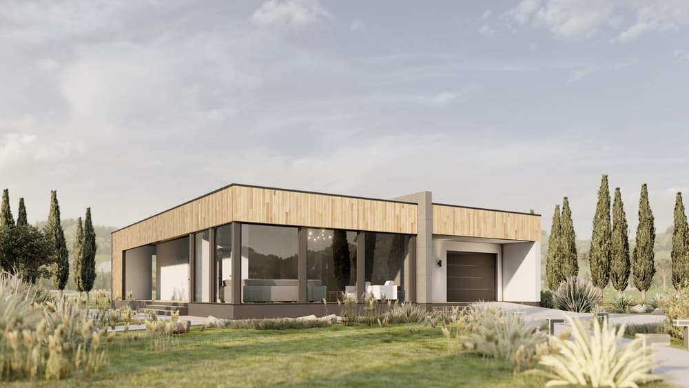 • Плоская или скатная утепленная кровля (пароизоляционная пленка, утеплитель вата на основе стекловолокна или базальта, гидро-ветрозащитная мембрана) с покрытием из металлочерепицы, полимерной мембраны или гибкой черепицы. (цена отличается от выбранного типа) (Ширина карнизного свеса от 30 см. Водосточная система в стоимость не входит